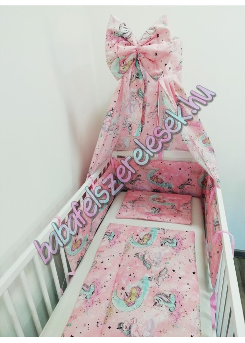 - csillogós rózsaszín unikornis mintájú 100% pamutvászon- muszlin (függönyös) baldachin függöny: A dekoráció és a por felfogásán kívül előnyös a átláthatóságában. A muszlinnál a babára ráláthat a babaágy oldalról bekukucskáló szülő.