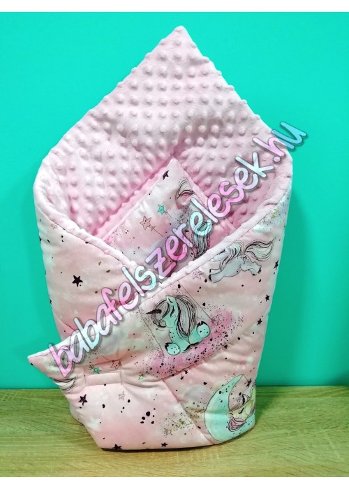 - Pihe-puha minky-s hátoldallal: Az egyik oldala csillogós rózsaszín unikornis mintájú 100% pamutvászonból készül, a másik oldala pedig pihe-puha meleg minky anyagból, közötte 2cm vastag vatelinnel bélelve.