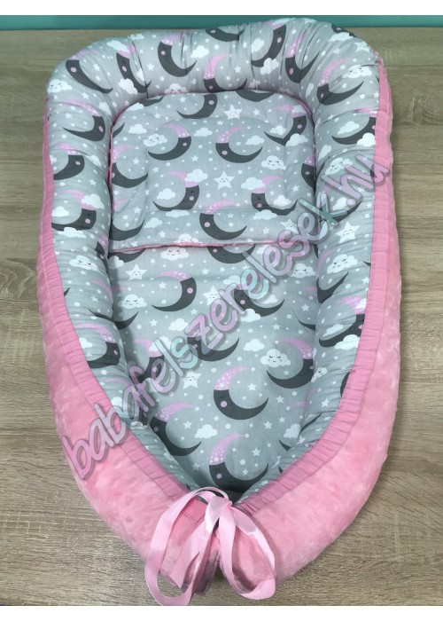 Babafészek - rózsaszín-szürke holdas + pihe-puha minky
