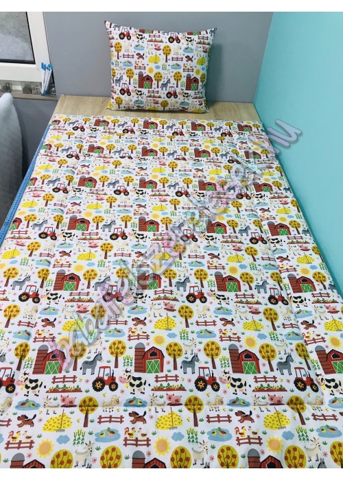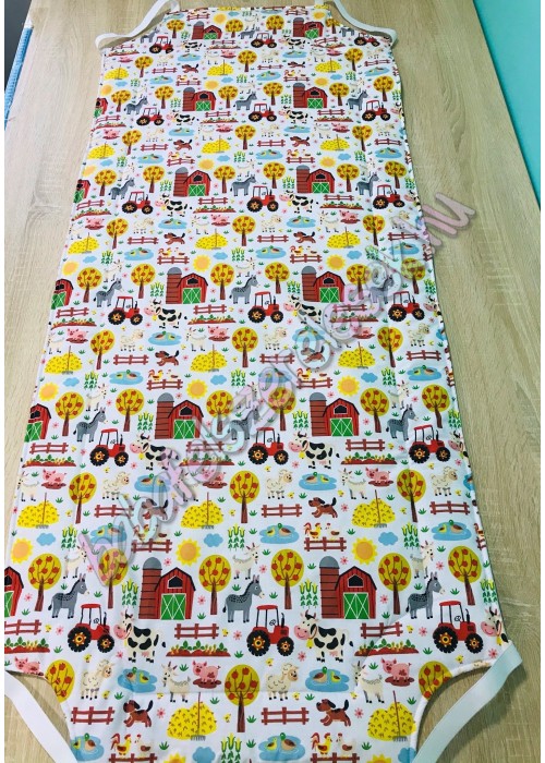 farmos traktoros mintájú 100% pamutvászonból készül, közötte 2cm vastag vatelinnel bélelve. Kb. 58X133-as standard méret, négy sarkán gumival, duplán varrva.