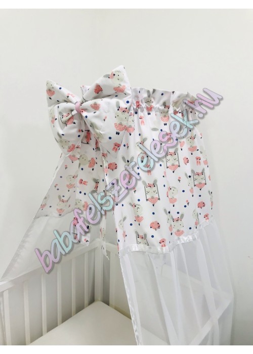 - Fehér balerina nyuszis mintájú 100% pamutvászon- muszlin (függönyös) baldachin függöny: A dekoráció és a por felfogásán kívül előnyös a átláthatóságában. A muszlinnál a babára ráláthat a babaágy oldalról bekukucskáló szülő.