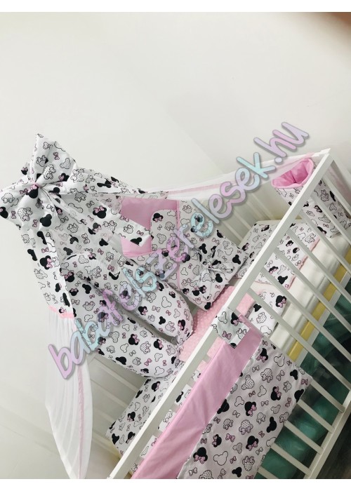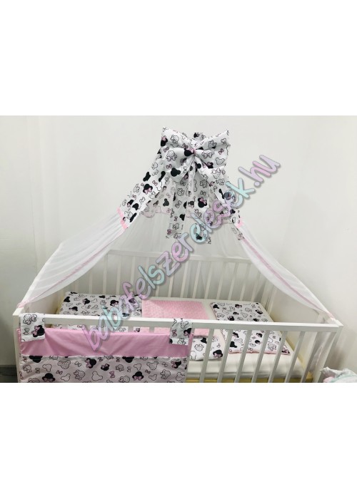 - rózsaszín minnie fejes mintájú 100% pamutvászon- muszlin (függönyös) baldachin függöny: A dekoráció és a por felfogásán kívül előnyös a átláthatóságában. A muszlinnál a babára ráláthat a babaágy oldalról bekukucskáló szülő.