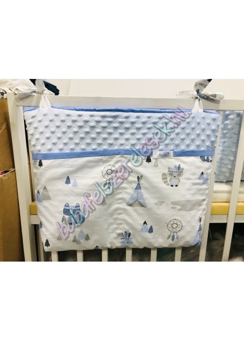 Szett tartalma: 70X90-es töltött takaró + lapos alvós kispárna (hátoldala mindkettőnek pihe-puha minky) + 4 darab világoskék minky párnás rácsvédő (30X30cm) + 2 darab szürke minky párnás rácsvédő (30X30cm) + zsebes tároló