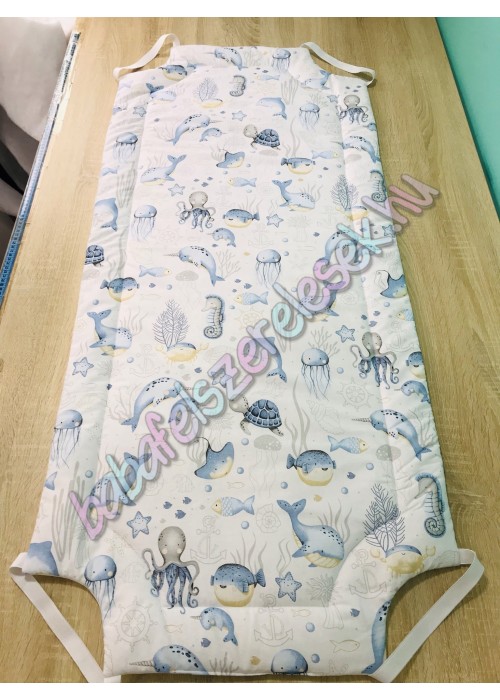 Kék tengeres mintájú 100% pamutvászonból készül, közötte 2cm vastag vatelinnel bélelve. Kb. 58X133-as standard méret, négy sarkán gumival, duplán varrva.