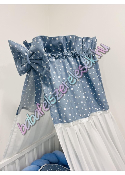 - Középkék csillagos mintájú 100% pamutvászon- muszlin (függönyös) baldachin függöny: A dekoráció és a por felfogásán kívül előnyös a átláthatóságában. A muszlinnál a babára ráláthat a babaágy oldalról bekukucskáló szülő.