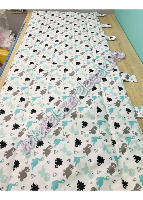 • A falvédő dupla anyagból készül, külseje menta-szürke dínós mintás 100% pamutvászon, hátulja egyszínű 100% pamutvászon, közötte 150gr  vatelinnel bélelve.