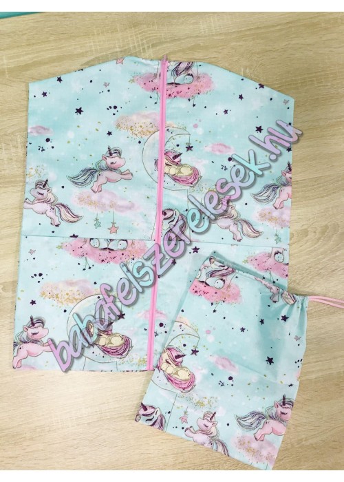 Menta unikornisos mintájú 100% pamutvászonból készül, kb. 45X50-es méret, elől két zsebbel, végig cipzározható.(fogassal feltehető)