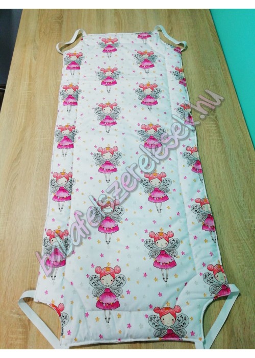 fehér tündéres mintájú 100% pamutvászonból készül, közötte 2cm vastag vatelinnel bélelve. Kb. 58X133-as standard méret, négy sarkán gumival, duplán varrva.