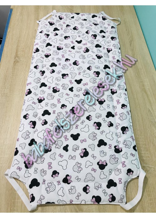 Rózsaszín minnie fejes mintájú 100% pamutvászonból készül, közötte 2cm vastag vatelinnel bélelve. Kb. 58X133-as standard méret, négy sarkán gumival, duplán varrva.