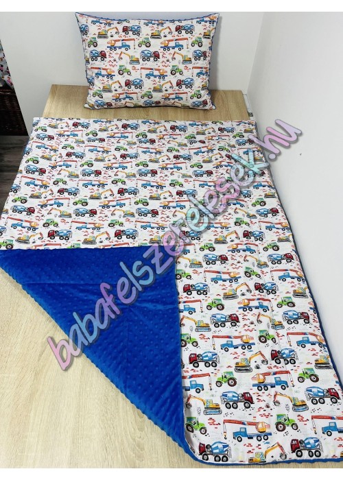 kb. 90X140-es töltött takaró (2cm vatelinnel bélelve.) + kb. 40X50-es párna. Nem lehúzható, 30-40 fokon egybe mosható