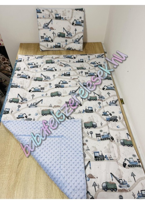 Prémium ágynemű: egyik oldala Kék-szürke útépítős mintájú 100% pamutvászonból készül, a másik oldala pedig pihe-puha meleg minky anyagból