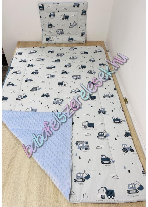 Prémium ágynemű: egyik oldala Kék traktoros mintájú 100% pamutvászonból készül, a másik oldala pedig pihe-puha meleg minky anyagból