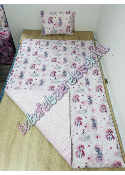 kb. 90X140-es töltött takaró (2cm vatelinnel bélelve.) + kb. 40X50-es párna. Nem lehúzható, 30-40 fokon egybe mosható