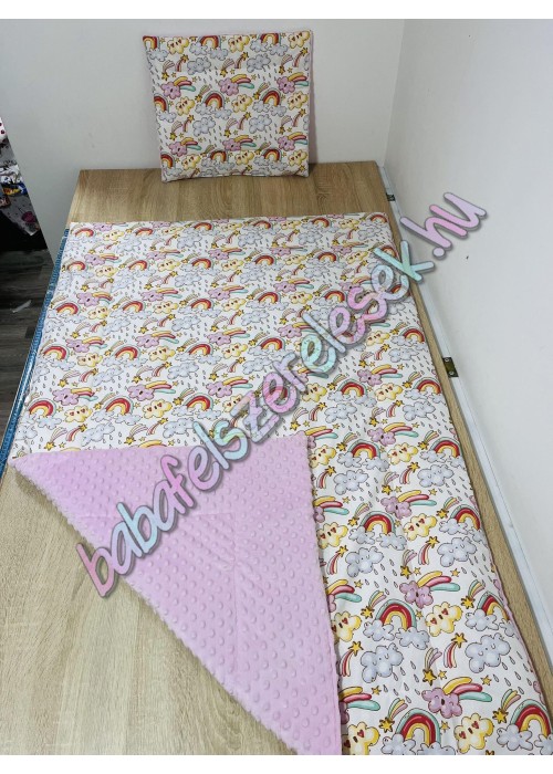 Prémium ágynemű: egyik oldala Rózsaszín szivárványos-csillagos mintájú 100% pamutvászonból készül, a másik oldala pedig pihe-puha meleg minky anyagból