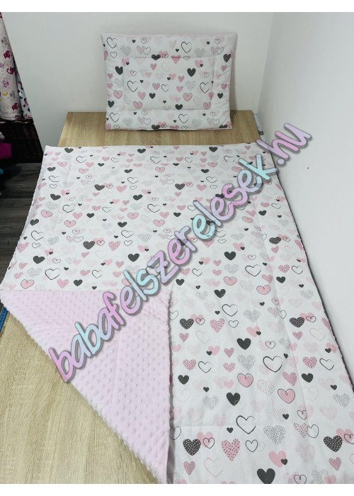 Prémium ágynemű: egyik oldala Rózsaszín-szürke szives mintájú 100% pamutvászonból készül, a másik oldala pedig pihe-puha meleg minky anyagból