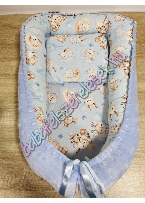 Prémium babafészek - babakék állatcsaládos + pihe-puha bársony velvet