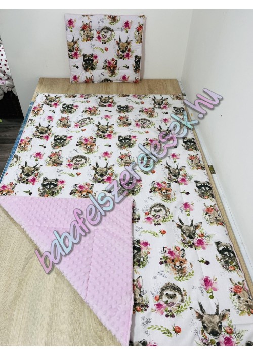 Prémium ágynemű: egyik oldala Erdő állatkái virággal mintájú 100% pamutvászonból készül, a másik oldala pedig pihe-puha meleg minky anyagból