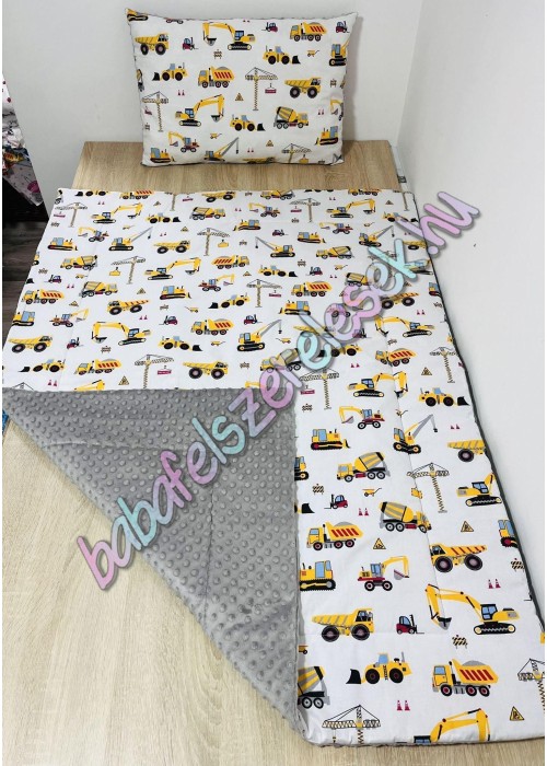kb. 90X140-es töltött takaró (2cm vatelinnel bélelve.) + kb. 40X50-es párna. Nem lehúzható, 30-40 fokon egybe mosható