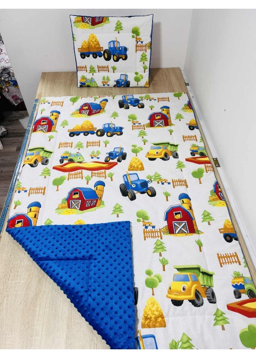 kb. 90X140-es töltött takaró (2cm vatelinnel bélelve.) + kb. 40X50-es párna. Nem lehúzható, 30-40 fokon egybe mosható