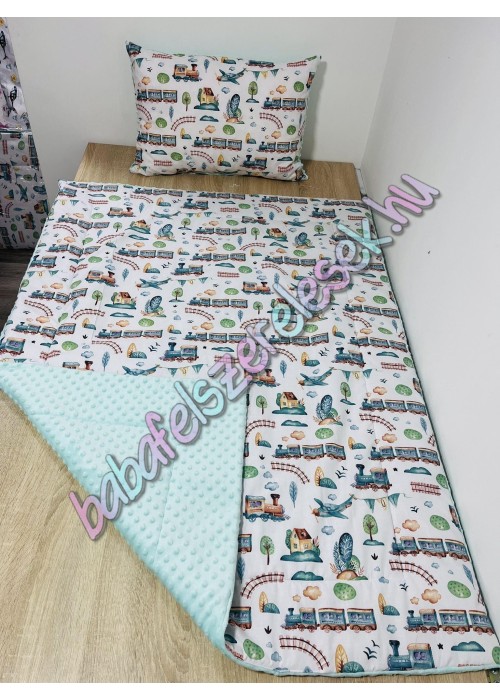 Prémium ágynemű: egyik oldala Menta-zsálya vonatos mintájú 100% pamutvászonból készül, a másik oldala pedig pihe-puha meleg minky anyagból
