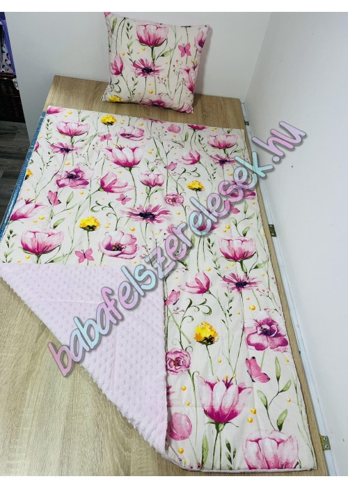 kb. 90X140-es töltött takaró (2cm vatelinnel bélelve.) + kb. 40X50-es párna. Nem lehúzható, 30-40 fokon egybe mosható