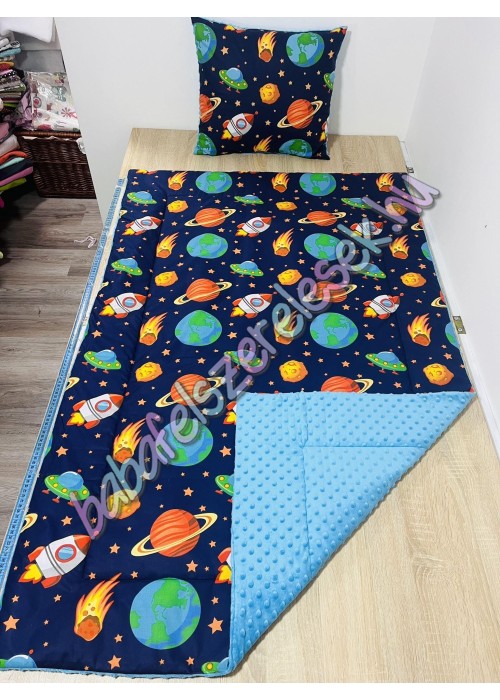 kb. 90X140-es töltött takaró (2cm vatelinnel bélelve.) + kb. 40X50-es párna. Nem lehúzható, 30-40 fokon egybe mosható