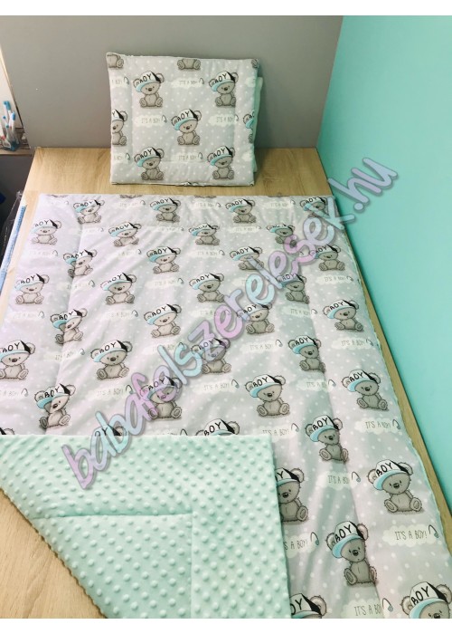 kb. 90X140-es töltött takaró (2cm vatelinnel bélelve.) + kb. 40X50-es párna. Nem lehúzható, 30-40 fokon egybe mosható