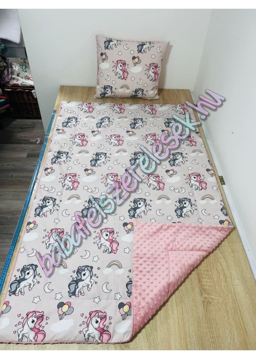 kb. 90X140-es töltött takaró (2cm vatelinnel bélelve.) + kb. 40X50-es párna. Nem lehúzható, 30-40 fokon egybe mosható