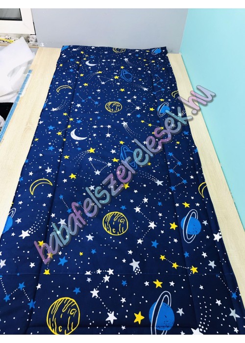 - A falvédő dupla anyagból készül, külseje Sötétkék bolygós mintás 100% pamutvászon, hátulja egyszínű 100% pamutvászon, közötte 1,5cm vastag vatelinnel bélelve.