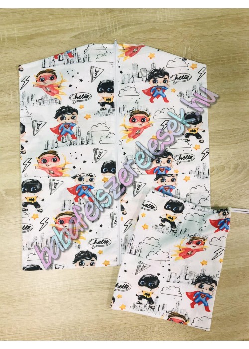 Szuperhősös mintájú 100% pamutvászonból készül, kb. 45X50-es méret, elől két zsebbel, végig cipzározható.(fogassal feltehető)