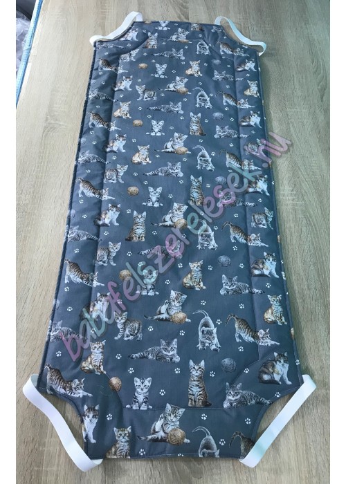 szürke alapon cicás mintájú 100% pamutvászonból készül, közötte 2cm vastag vatelinnel bélelve. Kb. 58X133-as standard méret, négy sarkán gumival, duplán varrva.