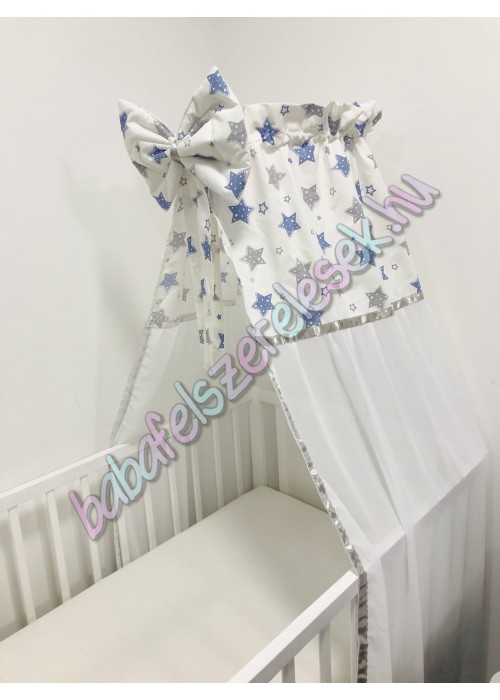 - Szürke-kék csillagos mintájú 100% pamutvászon- muszlin (függönyös) baldachin függöny: A dekoráció és a por felfogásán kívül előnyös a átláthatóságában. A muszlinnál a babára ráláthat a babaágy oldalról bekukucskáló szülő.